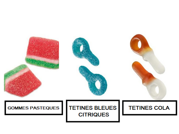 Exemple: bananes, poires citriques, peches, fraises, dragibus, etc...