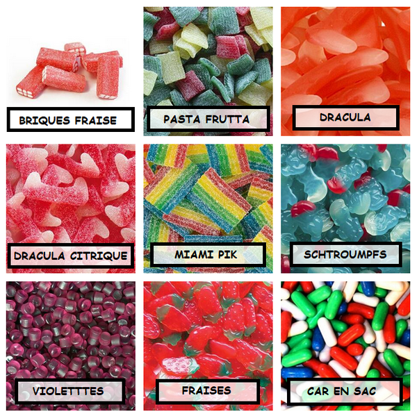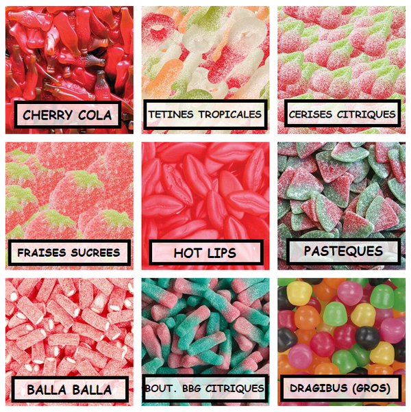 Exemple: bananes, poires citriques, peches, fraises, dragibus, etc...
