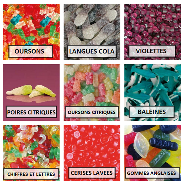 Exemple: bananes, poires citriques, peches, fraises, dragibus, etc...