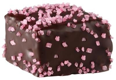 Lard saveur cerise enrobé de chocolat noir et éclats croustillants, artisanal et belge