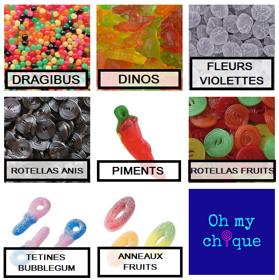 ATTENTION: choix de MAXIMUM 13 sortes de chiques pour 650gr