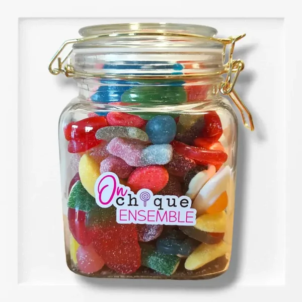 Grande bonbonnière en verre remplie avec +- 650gr de chiques à choisir dans la catégorie "chiques en vrac"*